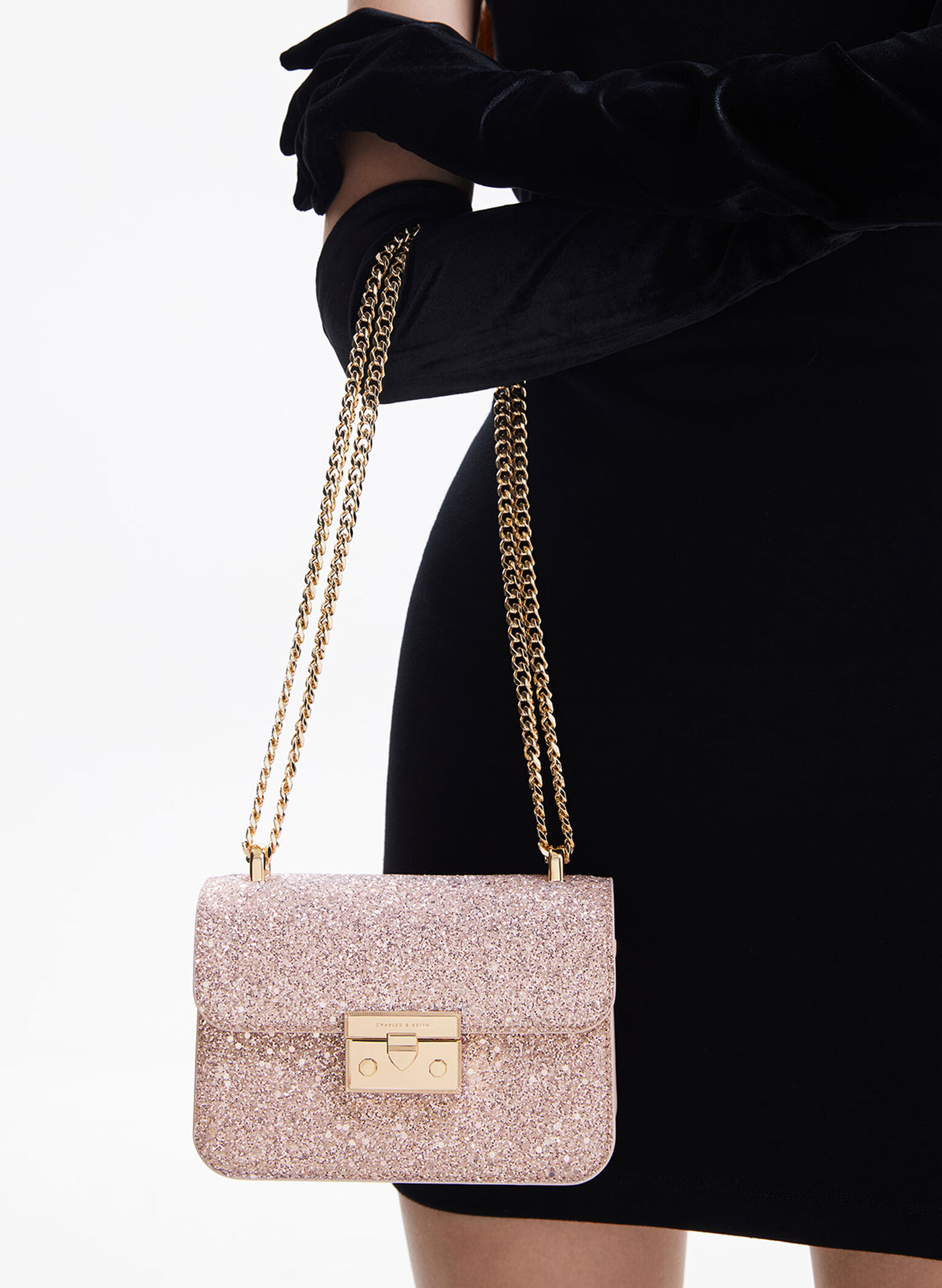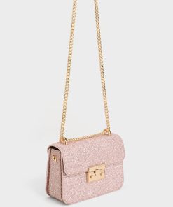 Made for dinner dates, party nights, and special occasions, this glittered handbag, featuring a stunning blush-pink exterior, is a dream come true for pink lovers. The glittering surface adds a touch of modern-day Barbie charm that you will instantly embody the moment you sling it on. Shiny gold-toned hardware perfectly complements the look, and the chain handle can be worn single- or double-strapped, offering versatile styling options.